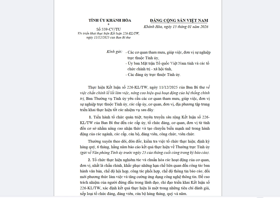 Ban Thường vụ Tỉnh ủy vừa có văn bản chỉ đạo các cơ quan tham mưu, giúp việc; đơn vị sự nghiệp trực thuộc Tỉnh ủy; các cấp ủy, cơ quan, đơn vị, địa phương tập trung thực hiện Kết luận số 226, ngày 11-12-2025 của Ban Bí thư về chấn chỉnh lề lối làm việc, nâng cao hiệu quả hoạt động của hệ thống chính trị.