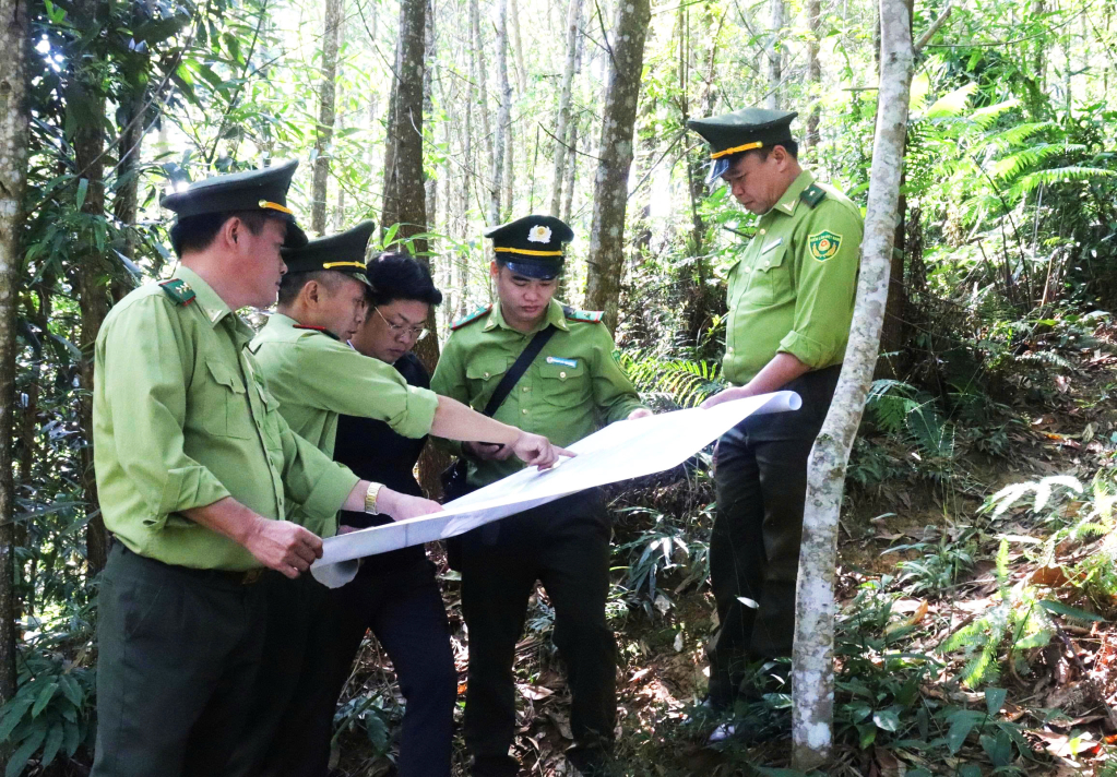 Hạt Kiểm lâm khu vực Thạch An kiểm tra thực địa, đối chiếu bản đồ rừng để nắm chắc hiện trạng, kịp thời tham mưu giải pháp quản lý, bảo vệ và phát triển rừng.
