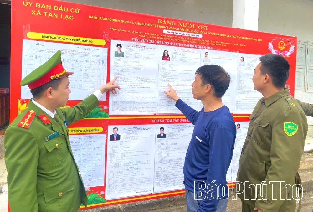 Cán bộ Công an xã Tân Lạc kiểm tra khu vực niêm yết danh sách ứng cử viên đại biểu Quốc hội.