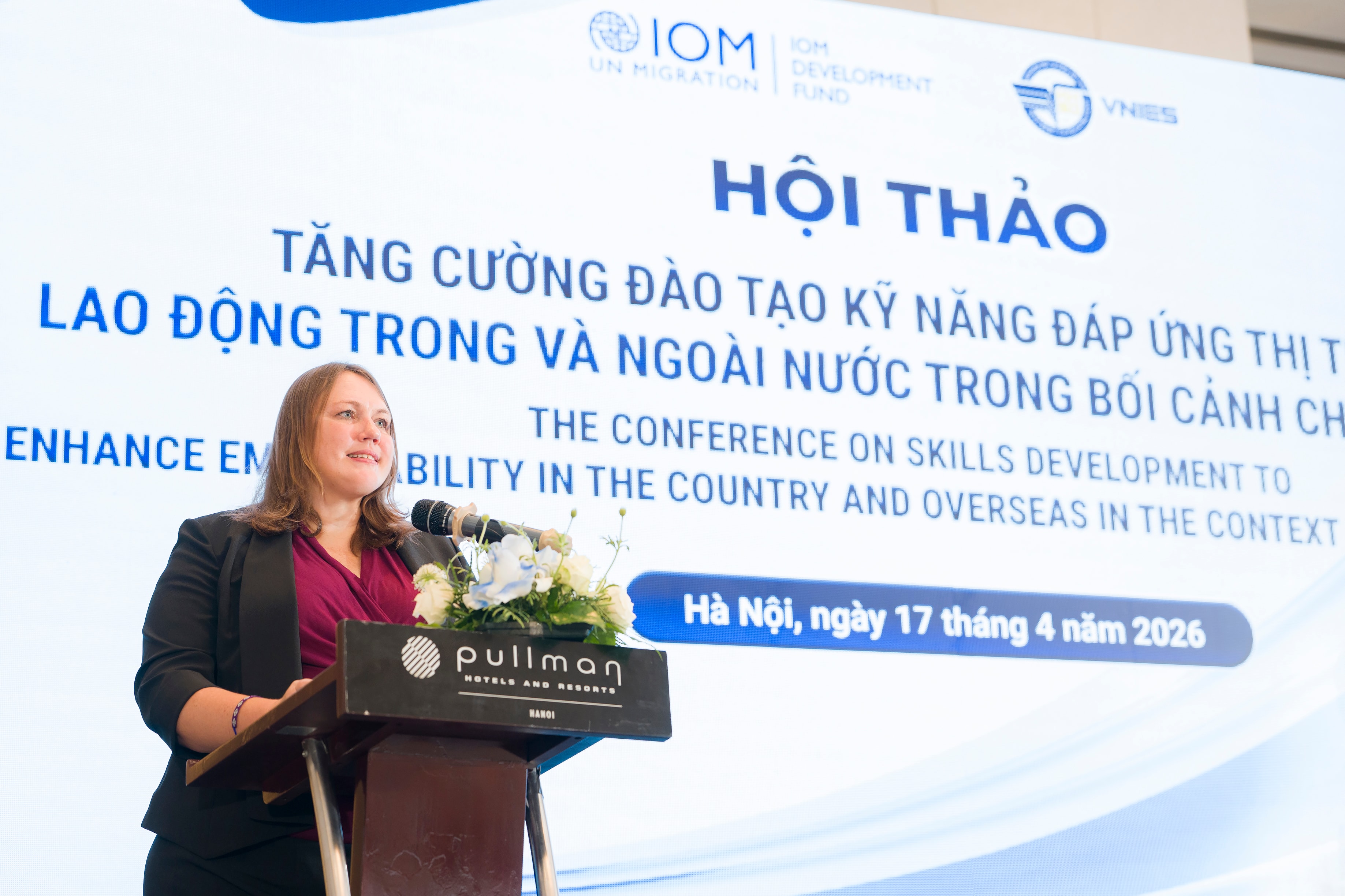 Trưởng Phái đoàn IOM tại Việt Nam Kendra Rinas phát biểu tại hội thảo, nhấn mạnh cần có các cơ chế công nhận bằng cấp, kỹ năng lẫn nhau để tăng cơ hội tiếp cận các cơ hội việc làm bền vững