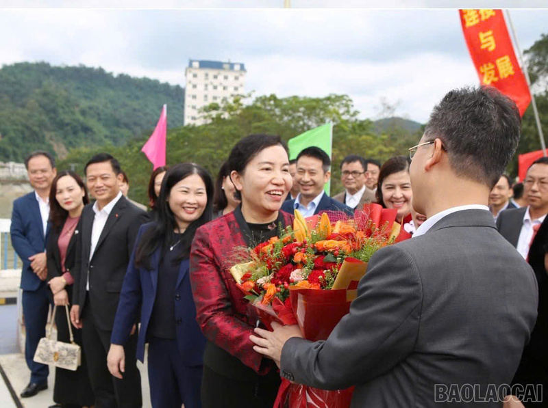 Phó Chủ tịch UBND tỉnh Nguyễn Thành Sinh và Phó Chủ tịch UBND tỉnh Vũ Thị Hiền Hạnh tiễn Đoàn đại biểu châu Hồng Hà (Trung Quốc) tại Cửa khẩu Quốc tế Lào Cai. Ảnh: Hữu Huỳnh - Trần Quang