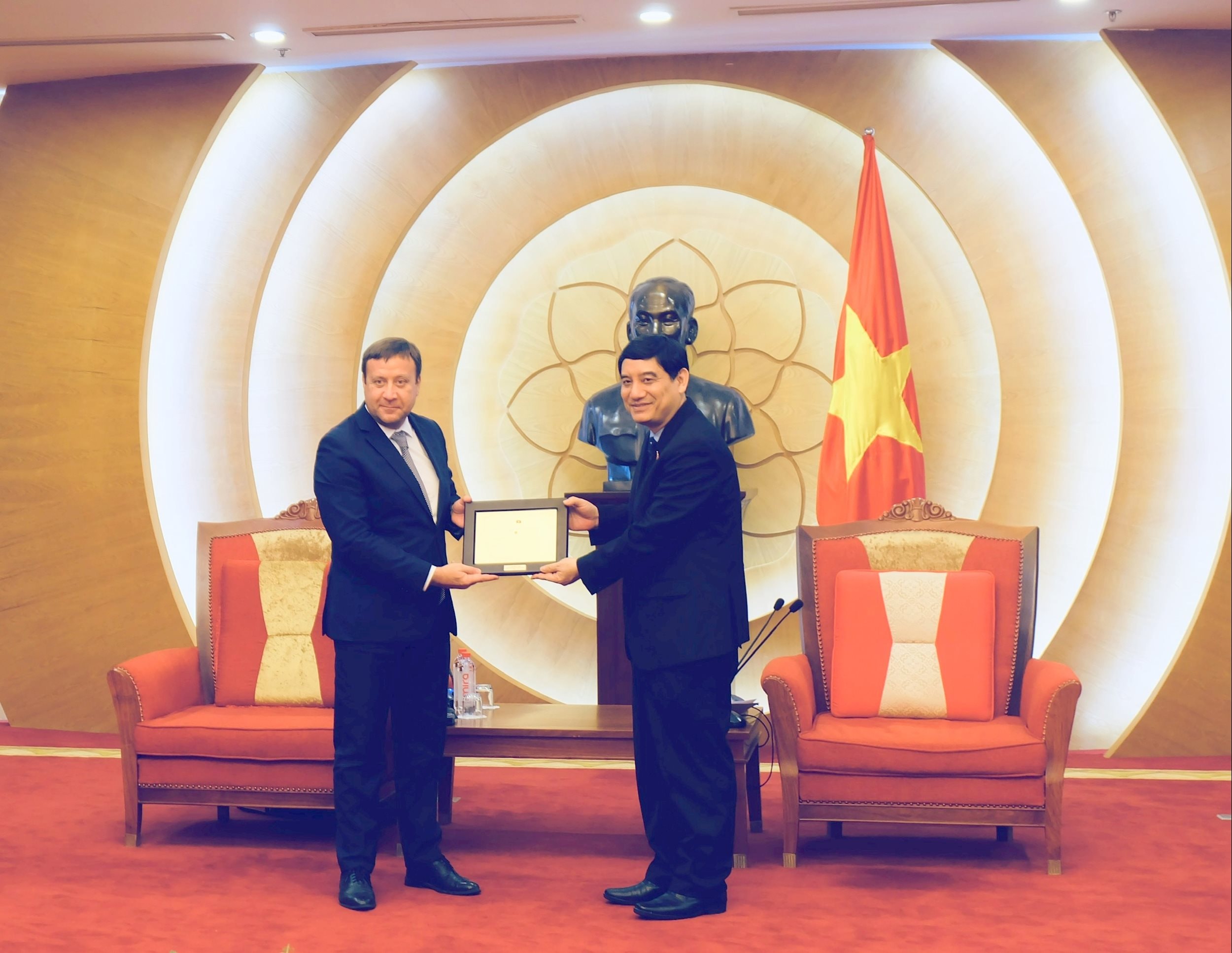 Chủ nhiệm Nguyễn Đắc Vinh tặng quà lưu niệm Đoàn công tác của Cơ quan Hợp tác Liên bang Nga - Rossotrudnichestvo