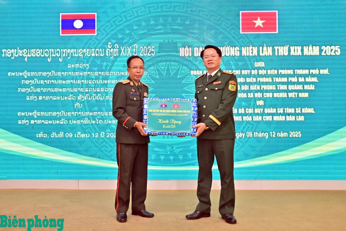 Lãnh đạo Ban Chỉ huy BĐBP thành phố Huế tặng quà Bộ Chỉ huy Quân sự tỉnh Sê Kông. Ảnh: Võ Tiến