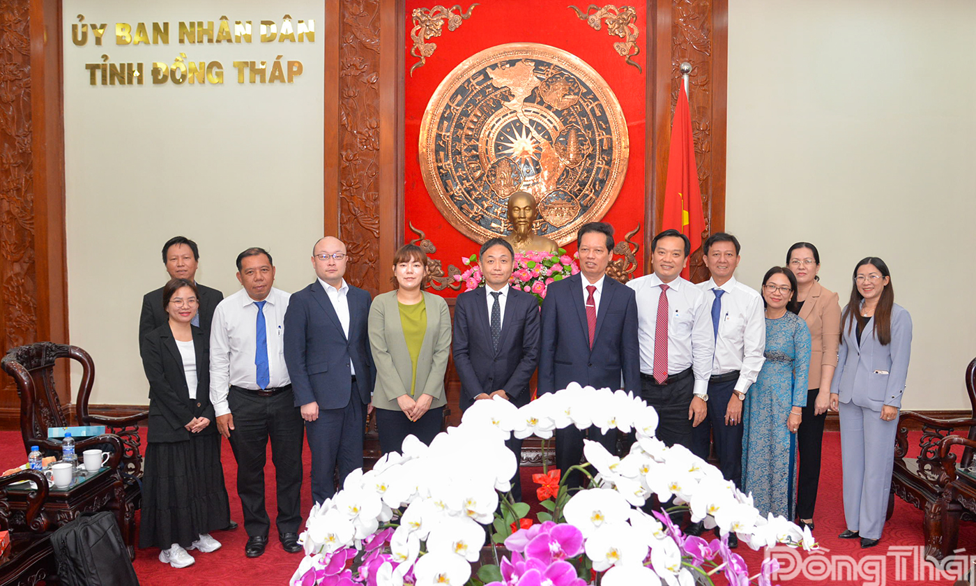 Đoàn công tác của Văn phòng Đại diện Tổ chức Xúc tiến Thương mại Nhật Bản tại TP. Hồ Chí Minh chụp ảnh lưu niệm với lãnh đạo tỉnh Đồng Tháp.