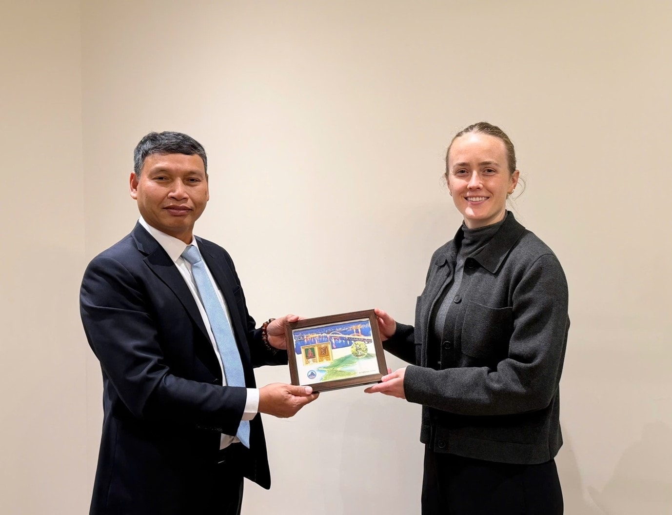 Phó Chủ tịch Thường trực UBND thành phố Đà Nẵng Hồ Kỳ Minh tặng quà lưu niệm cho đại diện Aligned Climate Capital sau buổi làm việc.