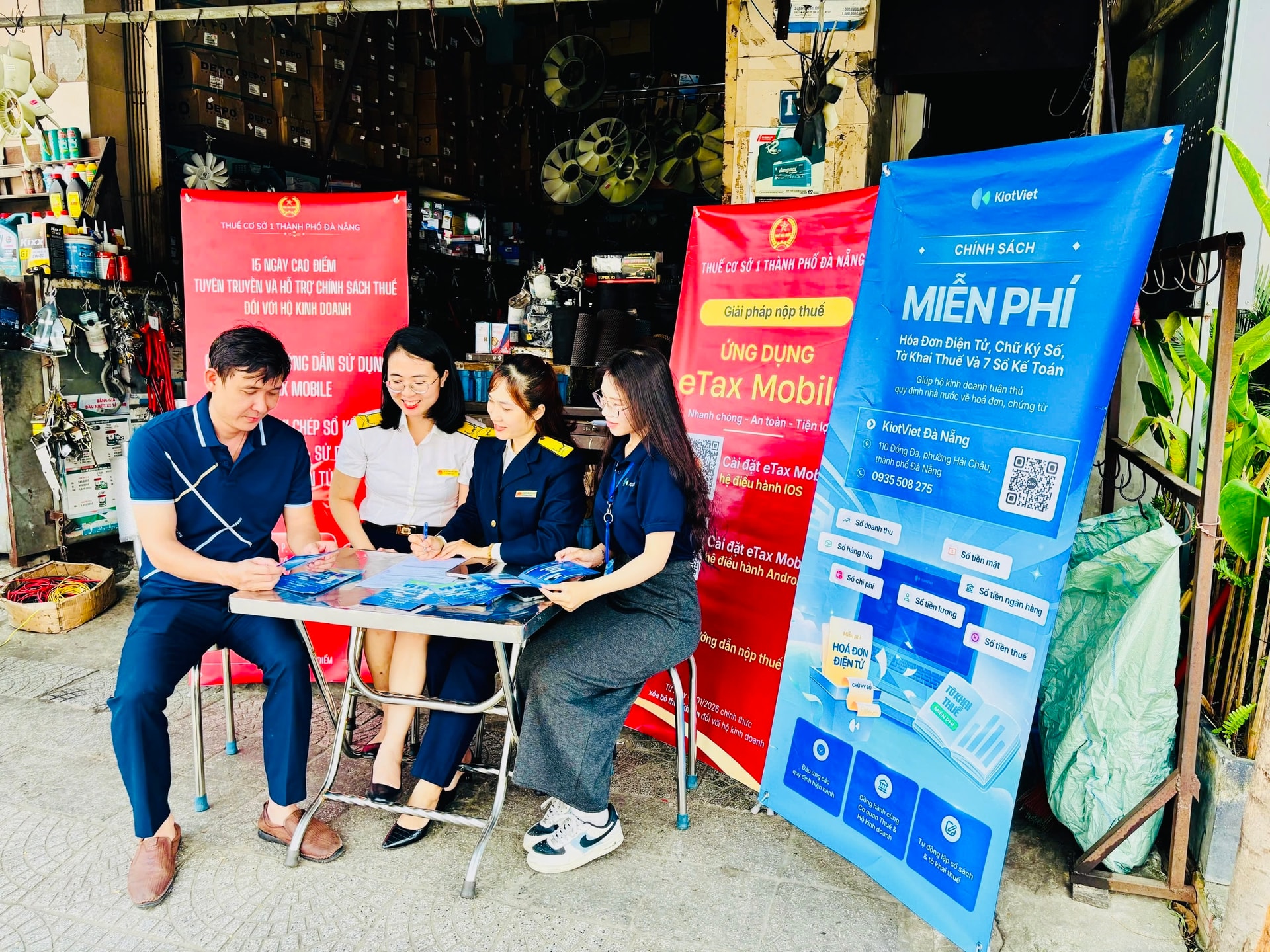 Ngành thuế Đà Nẵng tổ chức điểm hỗ trợ lưu động, tuyên truyền và hướng dẫn người nộp thuế cài đặt, sử dụng ứng dụng eTax Mobile, thúc đẩy chuyển đổi số trong quản lý thuế. Ảnh: K.H