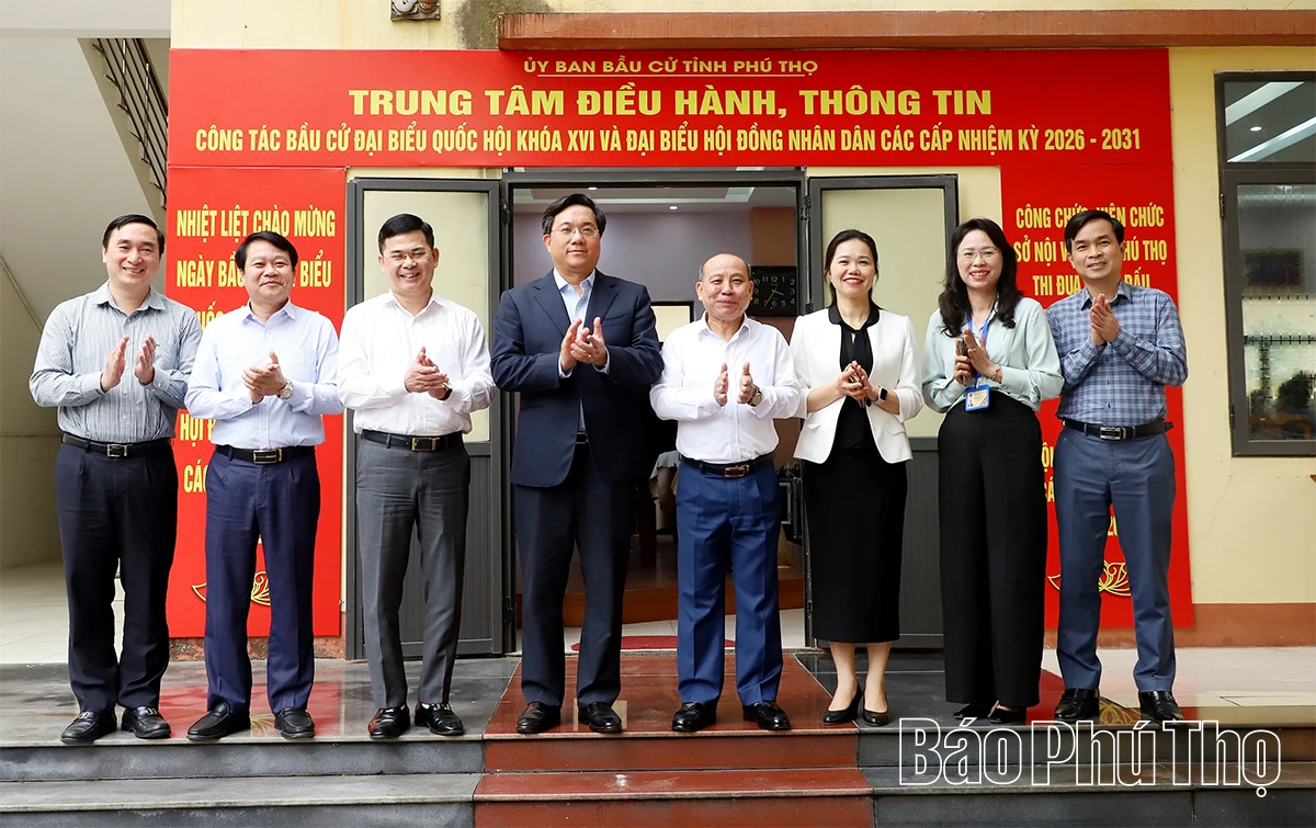 Các đồng chí lãnh đạo tỉnh nghe báo cáo hoạt động của Trung tâm điều hành, thông tin công tác bầu cử đại biểu Quốc hội khóa XVI và đại biểu HĐND các cấp nhiệm kỳ 2026-2031 tỉnh Phú Thọ.