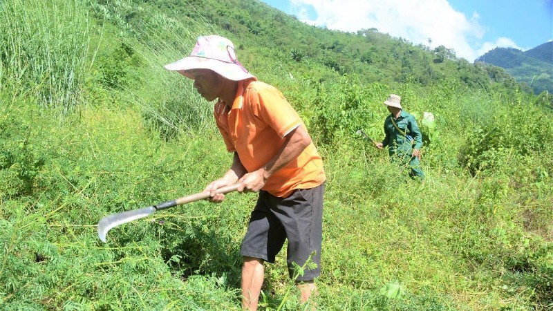 Người dân bản Hin, xã Na Sang phát cây bụi chăm sóc cây giổi xanh trồng theo dự án trồng rừng phòng hộ đầu nguồn.