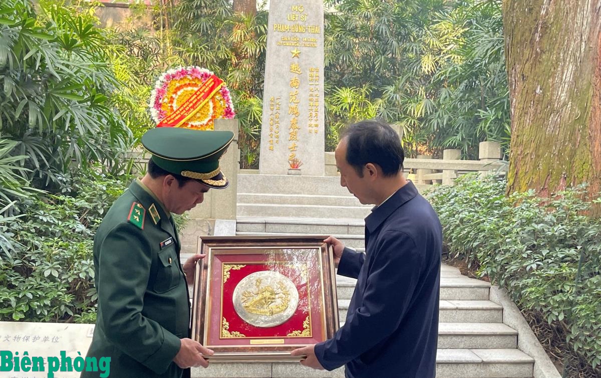 Trung tướng Vũ Trung Kiên tặng quà Ban quản lý Mộ liệt sĩ Phạm Hồng Thái, Nghĩa trang Hoàng Hoa Cương, thành phố Quảng Châu. Ảnh: Hoàng Sơn