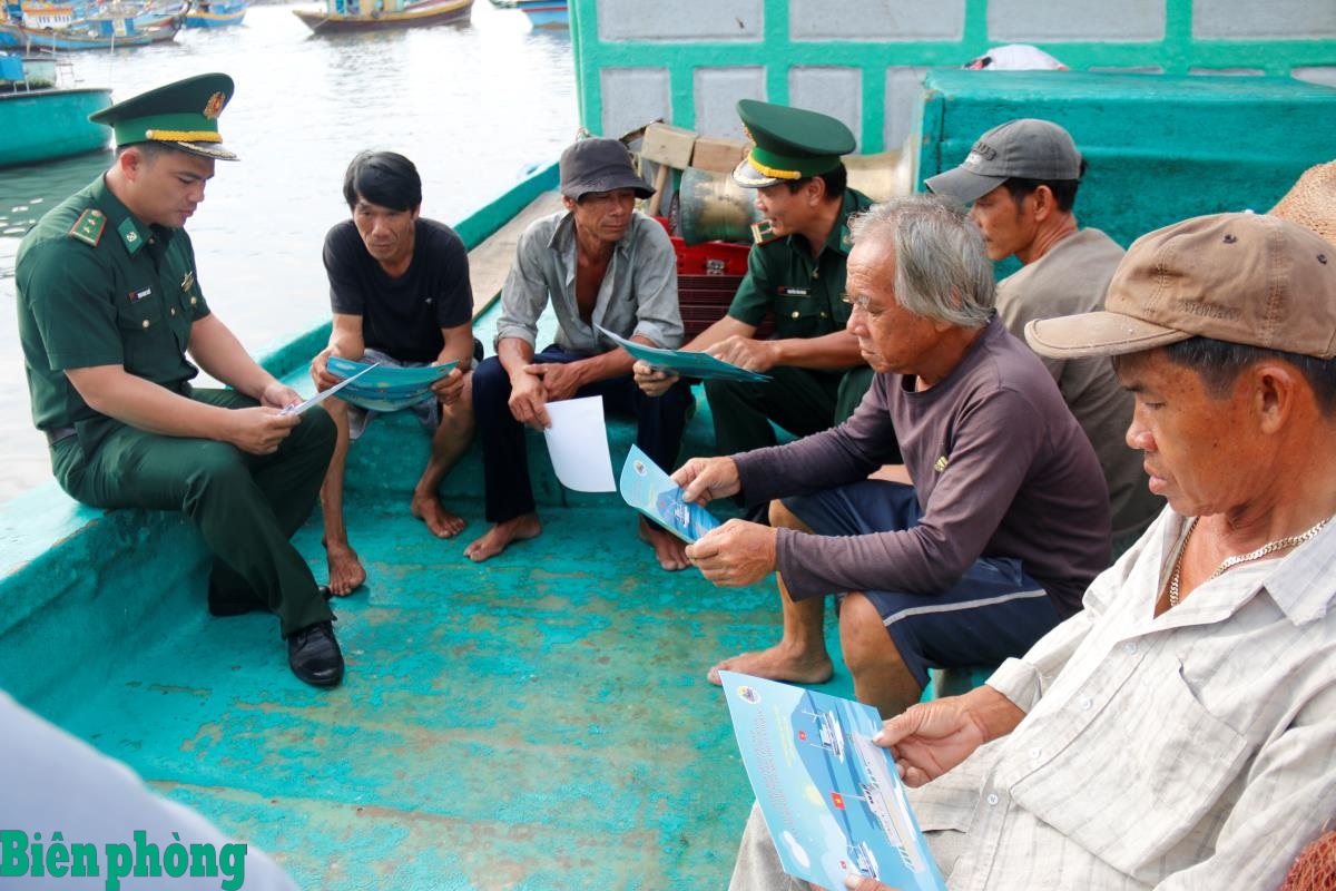 Cán bộ Đồn Biên phòng Thanh Hải, Bộ đội Biên phòng tỉnh Lâm Đồng tuyên truyền các quy định về chống khai thác IUU cho ngư dân. Ảnh: Trung Thành