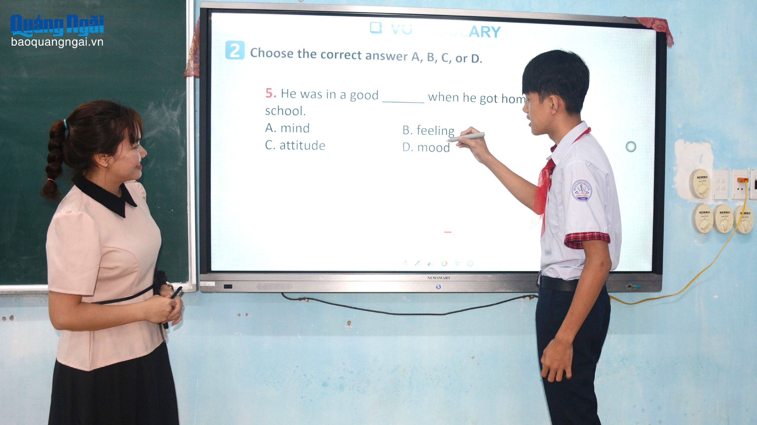 Trong tiết học tiếng Anh tại lớp 9B, cô giáo Lê Thị Mỹ Hảo, Trường THCS Hành Tín Tây ứng dụng bảng tương tác thông minh (Interactive Whiteboard), cho phép HS thao tác trực tiếp trên màn hình tivi kết nối internet bằng tay hoặc bút cảm ứng. Không cần phấn trắng, bảng đen, HS có thể chọn đáp án, thực hành hội thoại hoặc tham gia trò chơi ngôn ngữ ngay trên màn hình cảm ứng.