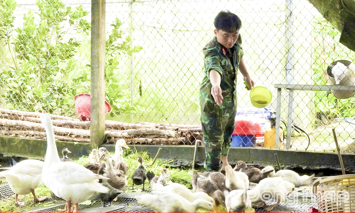 Hằng ngày, sau khi hoàn thành huấn luyện và các nhiệm vụ chính trị của đơn vị, cán bộ, chiến sĩ BCH Phòng thủ khu vực 1 - Long Thuận, tỉnh Đồng Tháp lại tập trung chăm sóc vườn rau, ao cá, vịt.