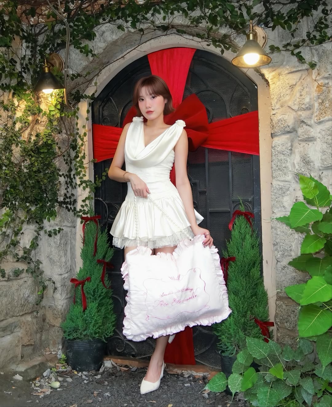 #5. Emma Nhất Khanh - 5,5/10 điểm: Emma Nhất Khanh lặp lại lỗi tham chi tiết trong tuần qua. Cô diện chiếc váy trắng thừa chi tiết thiếu điểm nhấn trong một bộ hình. Thiết kế bao gồm phần cổ đổ, hoa 3D trên vai và chi tiết xếp lớp chất liệu ren phía dưới. Cô xách thêm chiếc túi hình gối màu hồng pastel, bổ sung dây đeo đính kết ngọc trai. Các chi tiết không liên quan khiến tổng thể trở nên rời rạc, thiếu sự thống nhất. Emma Nhất Khanh hoàn toàn mất điểm với sự lựa chọn, phối đồ này. Ảnh: @feifeikhanh.