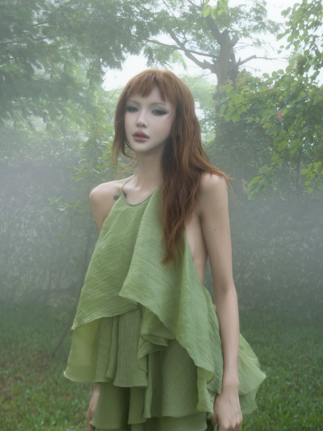 #2. Lâm Minh - 8/10 điểm: Lâm Minh thành công khi theo mốt khoe bên ngực lấp ló trong tuần này. Người mẫu ảnh diện chiếc váy cổ yếm, xếp lớp màu xanh dương, khoét toàn bộ phía sau, giúp người mặc phô diễn tấm lưng trần và hai bên ngực gợi cảm. Thiết kế đến từ một thương hiệu nội địa, đặc biệt phù hợp với vóc dáng thanh mảnh của Lâm Minh. Tín đồ thời trang này cũng thực hiện layout makeup nhấn vào màu mắt xanh lá, bổ sung kiểu tóc mái bằng màu cam nổi bật trong bối cảnh rừng cây. Ảnh: @lamiinh.
