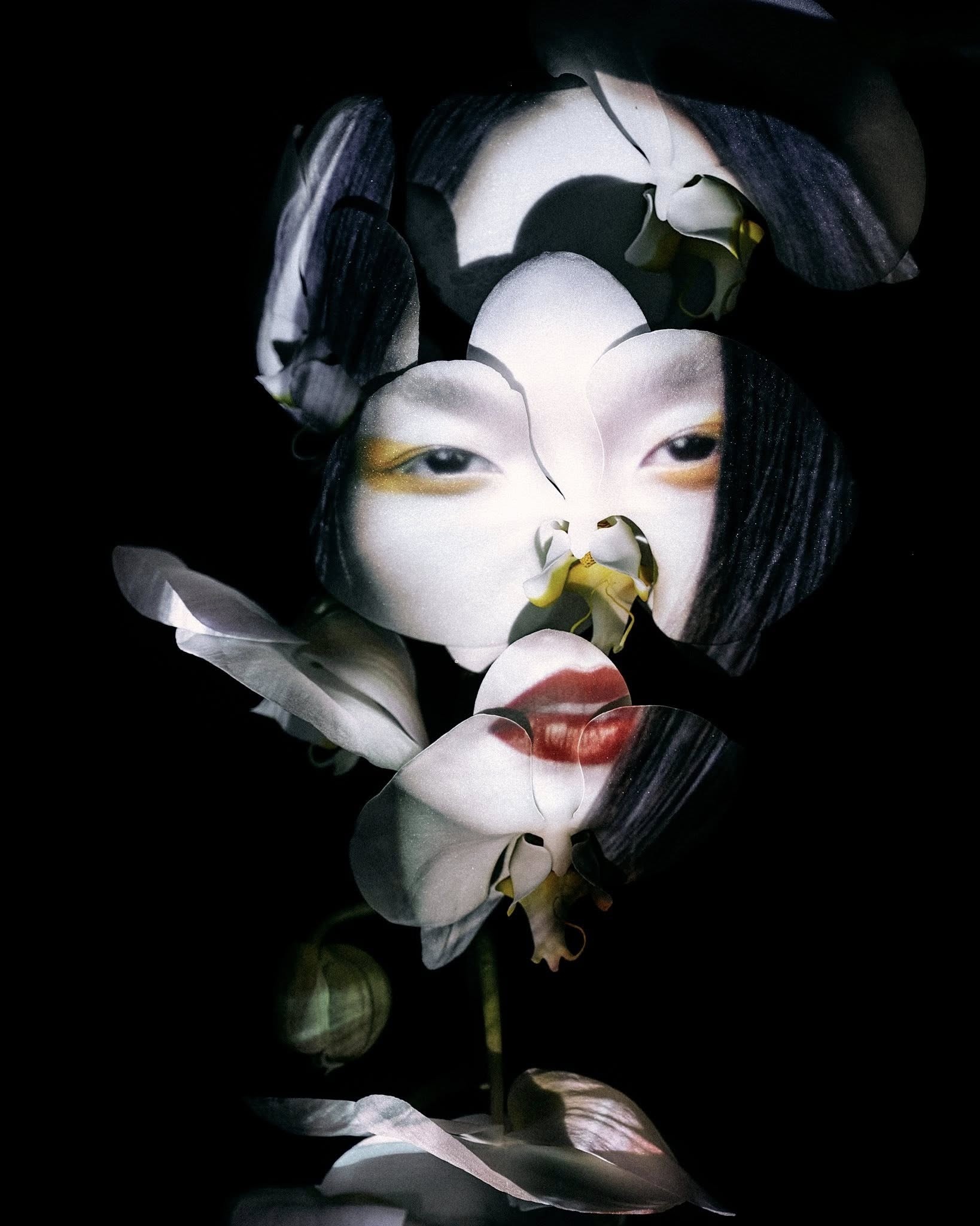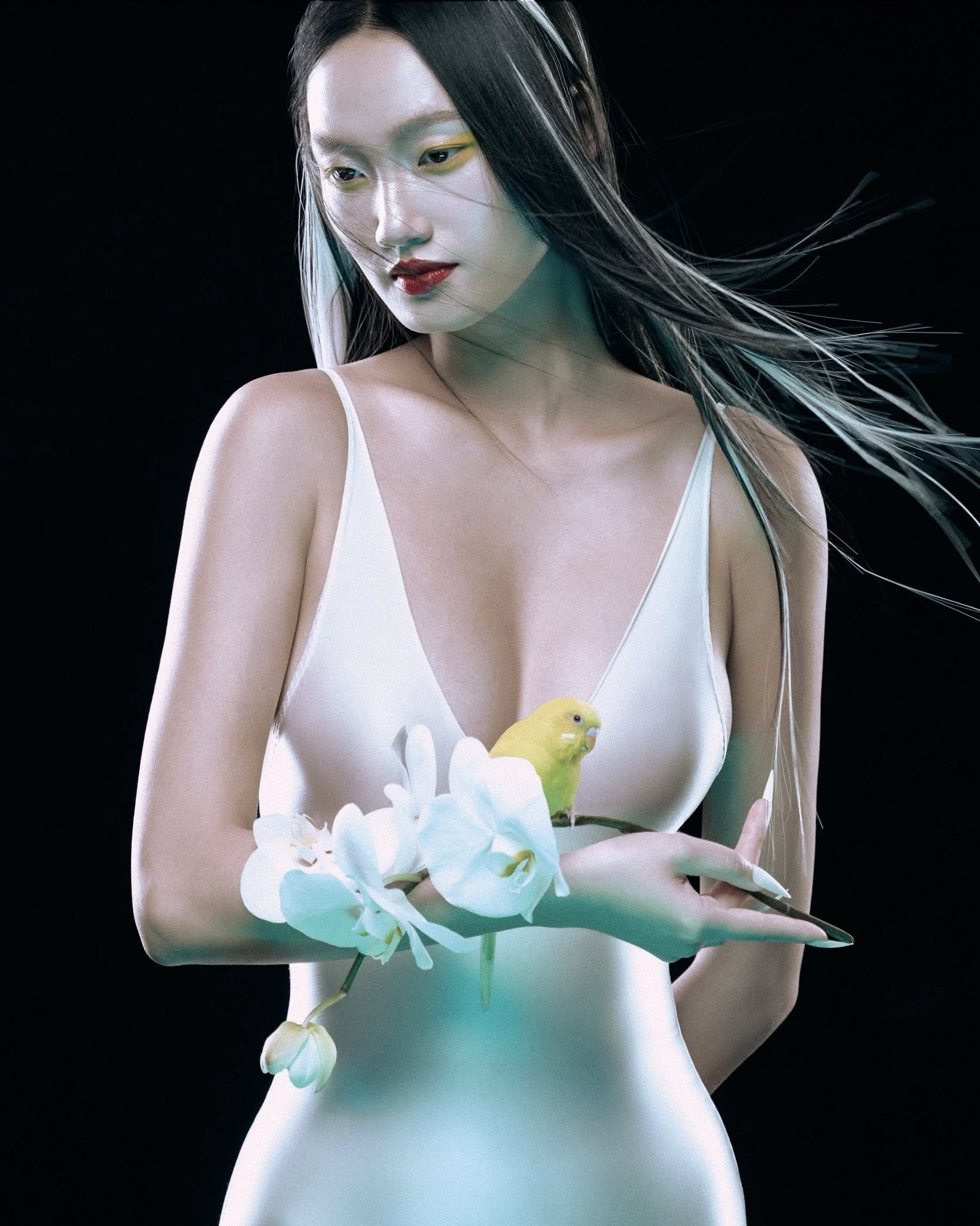 #1. Quỳnh Anh - 8,5/10 điểm: Người mẫu Quỳnh Anh gây ấn tượng với tạo hình đậm nét Á Đông trong tuần qua. Cô trang điểm kiểu geisha, nhấn vào đôi môi đỏ đậm trên nền da trắng bột phấn. Mái tóc đen dài bổ sung sợi light trắng phù hợp với hình tượng ma mị, bí ẩn và quyến rũ này. Quỳnh Anh diện chiếc váy trắng xẻ sâu chất liệu satin của nhà thiết kế Lê Thanh Hòa, hướng sự chú ý vào vòng một đầy đặn, quyến rũ. Cành lan trở thành đạo cụ thích hợp, gợi liên tưởng đến hình tượng công chúa Mộc Lan. Quỳnh Anh hoàn toàn ghi điểm với hình ảnh ấn tượng, phá cách này. Ảnh: Quỳnh Anh/FB.