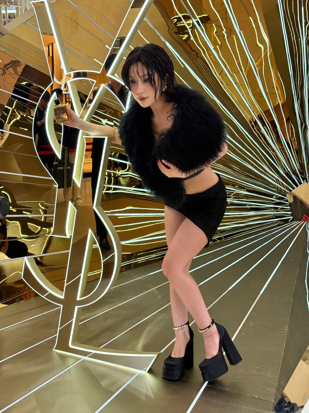 #4. Quỳnh Thi - 6/10 điểm: Cũng theo đuổi mốt khoe bên ngực như Lâm Minh, song Quỳnh Thi không ghi điểm với sự lựa chọn trang phục rườm rà, khó hiểu. Cụ thể, tín đồ thời trang này diện chiếc áo lông nửa người với những khoảng hở táo bạo, khoe khéo hai bên vòng một đầy đặn. Tuy nhiên, phần áo lông tương đối lớn khiến tổng thể trở nên rối mắt, thậm chí che bớt phần cổ của người mặc. Quỳnh Thi vì thế để lộ khuyết điểm cổ ngắn trong tạo hình này. Mái tóc ngắn ướt nước cũng chưa thực sự phù hợp với outfit. Ảnh: @quynhthie.