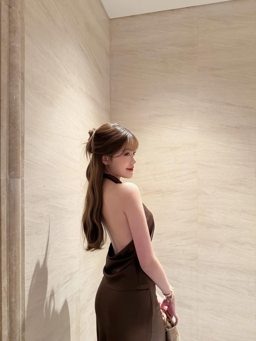 #3. Tăng Mỹ Hàn - 7/10 điểm: Tăng Mỹ Hàn ghi điểm với chiếc váy cổ yếm tông nâu chất liệu lụa. Chi tiết khoét sau giúp "bạn gái tin đồn" của HIEUTHUHAI khoe toàn bộ tấm lưng ong quyến rũ, gia tăng điểm nhấn cho tổng thể tạo hình đơn giản. Thiết kế tôn nổi làn da trắng sáng và vóc dáng đồng hồ cát của người mặc. Tăng Mỹ Hàn thực hiện kiểu tóc búi nửa đầu, hoàn thiện tạo hình đơn giản nhưng sang trọng, quyến rũ. Ảnh: @kjmbae.
