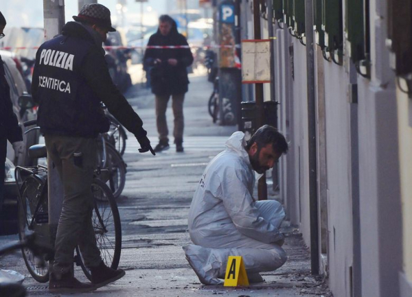 Lực lượng giám định hình sự Italy (Polizia Scientifica) thu thập dấu vết tại hiện trường một vụ nổ nhỏ ở trung tâm thành phố.