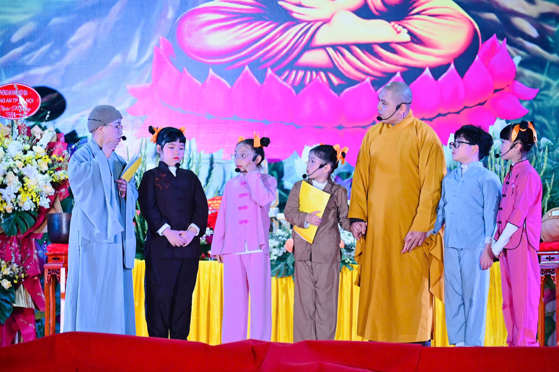 Tăng, ni sinh cùng học sinh trường Tiểu học Nguyễn Siêu diễn vở kịch tái hiện sự kiện vua Lý Công Uẩn dời đô về Thăng Long.