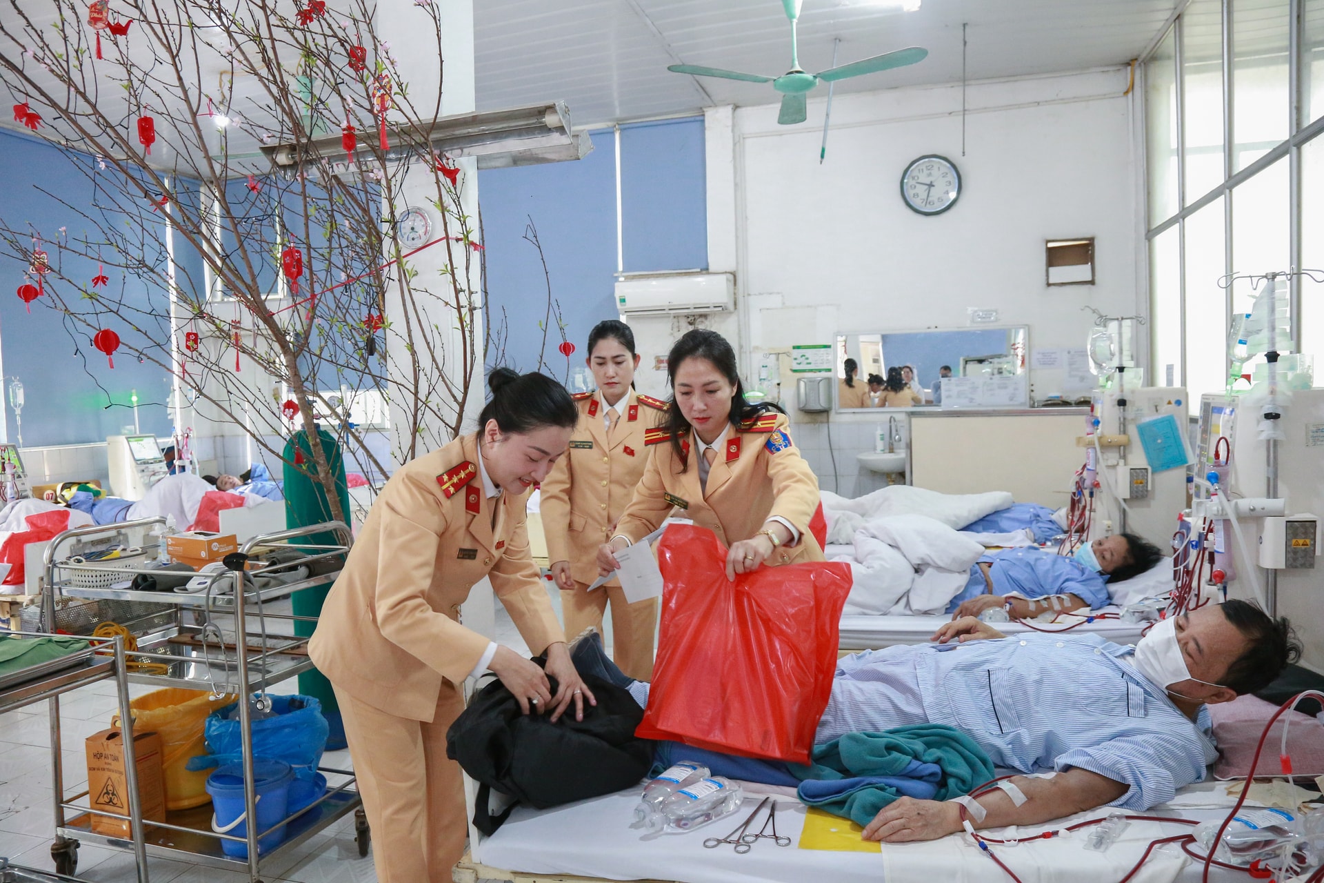 Trong không gian tưởng chừng chỉ có chuyên môn và kỹ thuật y khoa ấy, chiều 29 Tết năm nay có thêm một sắc màu khác. Hội Phụ nữ Phòng Cảnh sát giao thông Công an thành phố Hà Nội đã đến thăm và trao 27 phần quà cho các bệnh nhân đang điều trị tại khoa. Mỗi suất quà trị giá 500 nghìn đồng, được trao tận tay từng người bệnh ngay trong ca lọc máu.
