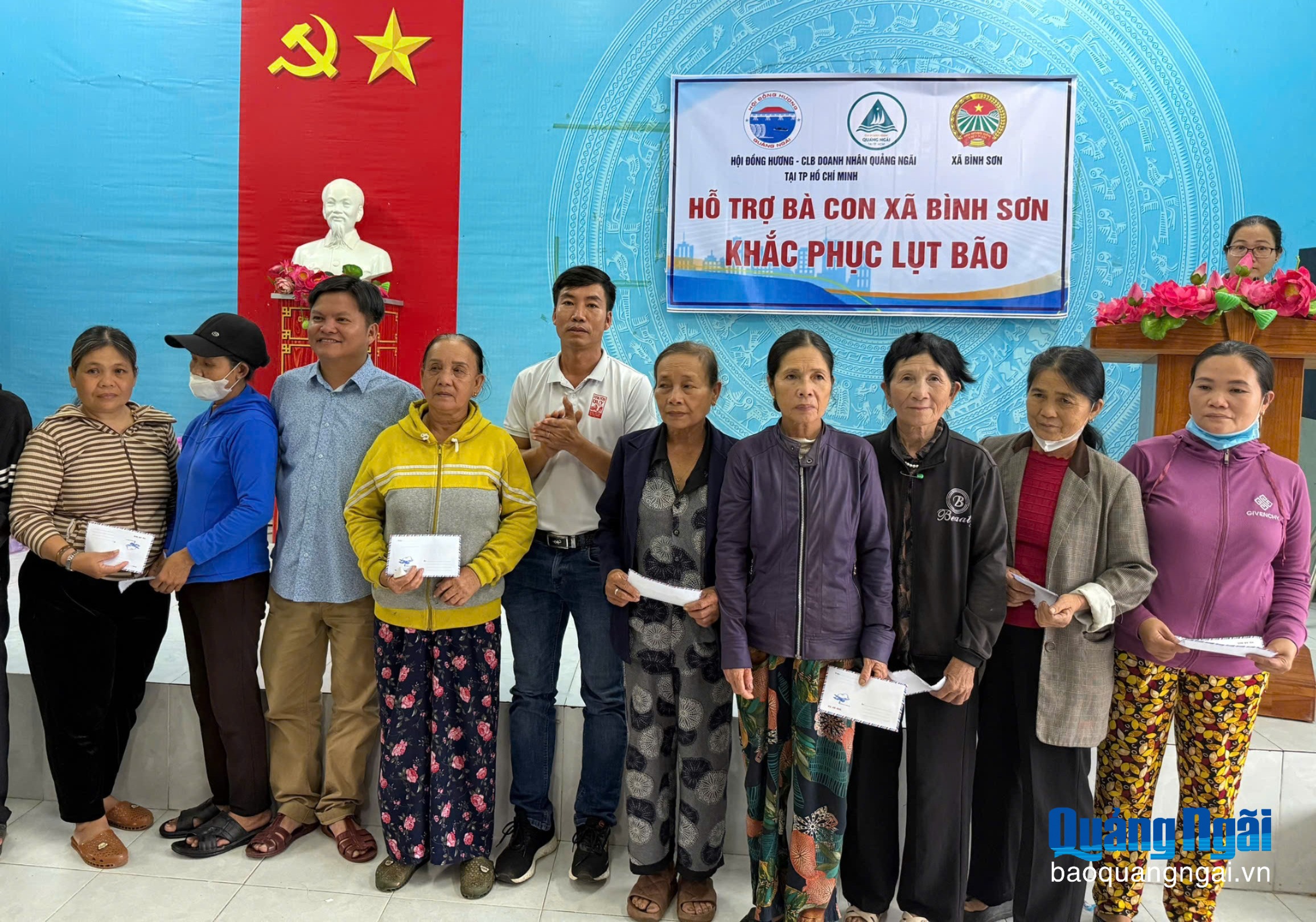 Hội đồng hương và Câu lạc bộ Doanh nhân Quảng Ngãi tại TP.Hồ Chí Minh còn đến thăm hỏi, tặng quà cho các hộ dân bị thiệt hại do thiên tai ở các xã Đông Sơn, Tịnh Khê và Long Phụng; tổng kinh phí đợt trao quà này là 160 triệu đồng.