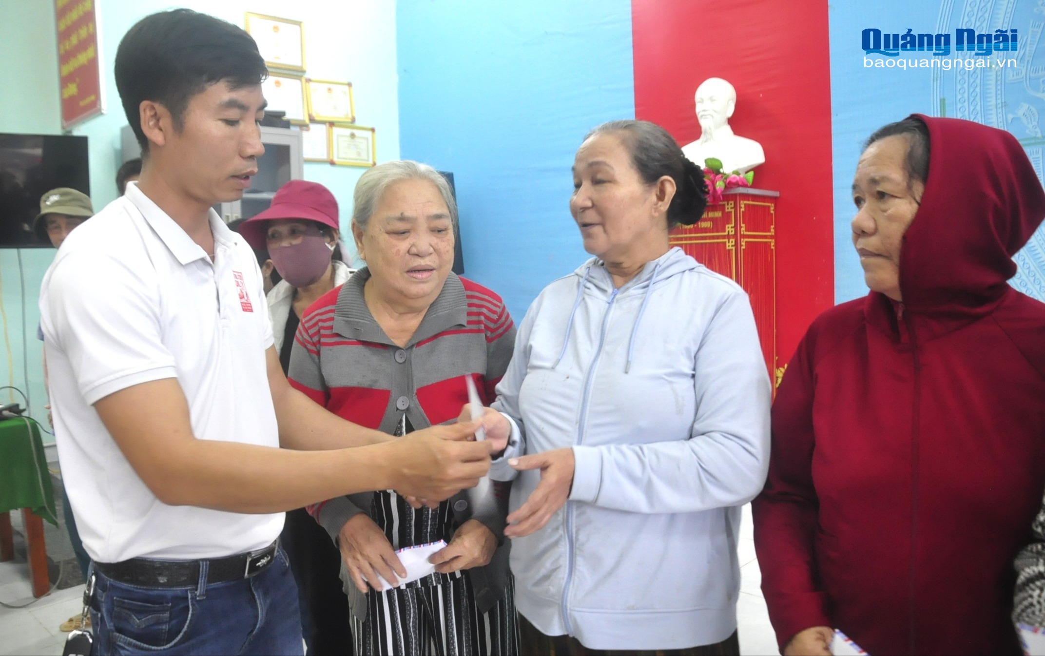 Đại diện Hội đồng hương và Câu lạc bộ Doanh nhân Quảng Ngãi tại TP.Hồ Chí Minh trao quà cho người dân xã Bình Sơn.
