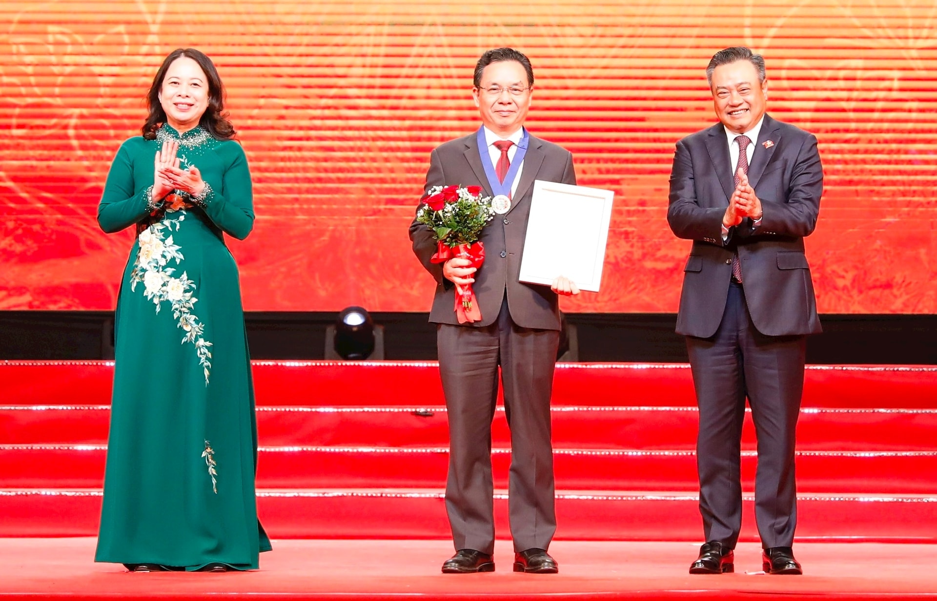 Phó Chủ tịch nước Võ Thị Ánh Xuân, Chủ tịch UBND thành phố Hà Nội Trần Sỹ Thanh trao danh hiệu "Công dân Thủ đô ưu tú" tặng Giáo sư, Tiến sĩ Kinh tế, Giảng viên Cao cấp, Nhà giáo nhân dân Hoàng Văn Cường, nguyên Phó Hiệu trưởng Trường Đại học Kinh tế Quốc dân. Ảnh: Viết Thành