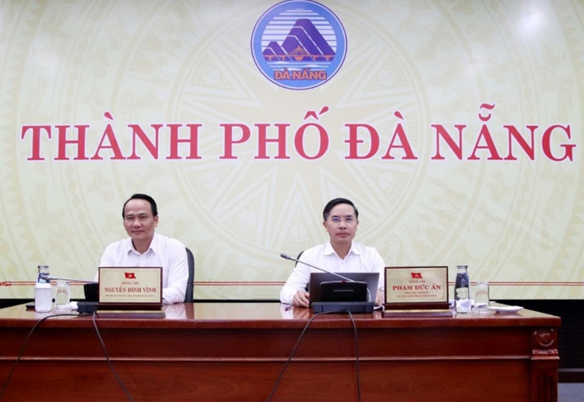 Phó Bí thư Thường trực Thành ủy Nguyễn Đình Vĩnh; Phó Bí thư Thành ủy, Chủ tịch UBND thành phố Phạm Đức Ấn chủ trì tại điểm cầu Đà Nẵng.