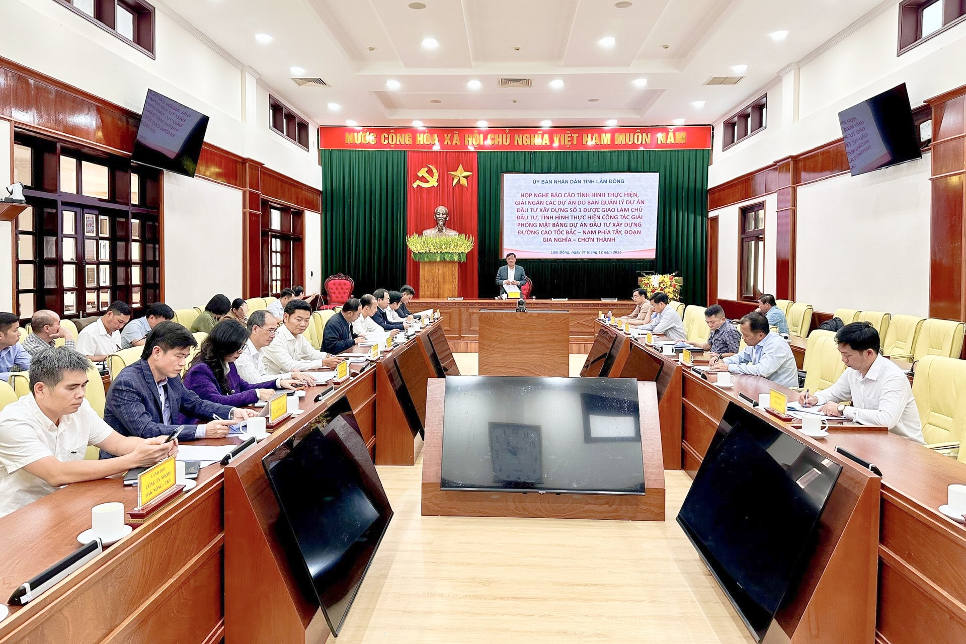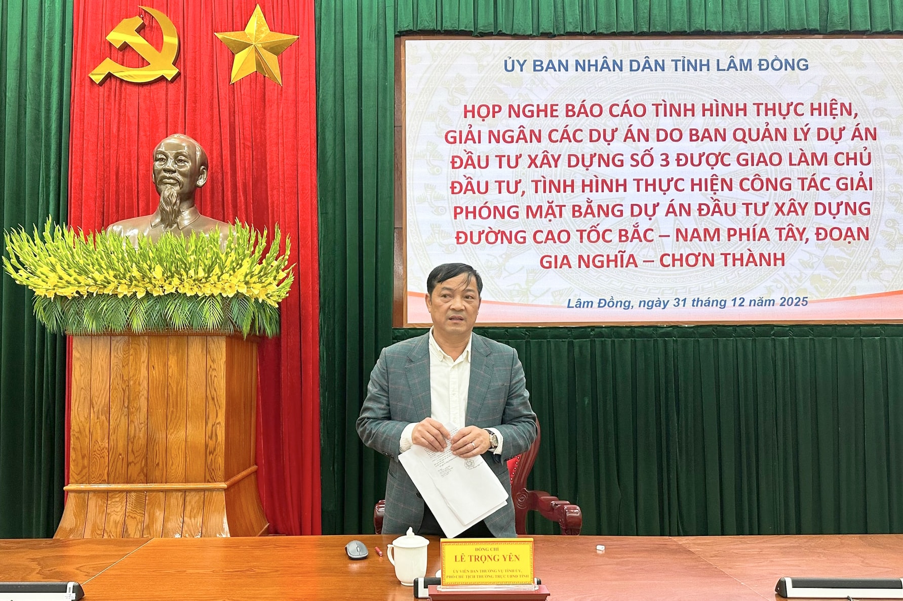 Chiều ngày 31/12, đồng chí Lê Trọng Yên, Ủy viên Ban Thường vụ Tỉnh ủy, Phó Chủ tịch Thường trực UBND tỉnh Lâm Đồng chủ trì cuộc họp nghe báo cáo tình hình thực hiện giải ngân các dự án do Ban Quản lý dự án đầu tư xây dựng số 3 được giao làm chủ đầu tư, tình hình thực hiện công tác giải phóng mặt bằng dự án đầu tư xây dựng đường cao tốc Bắc - Nam phía Tây, đoạn qua Gia Nghĩa - Chơn Thành.
