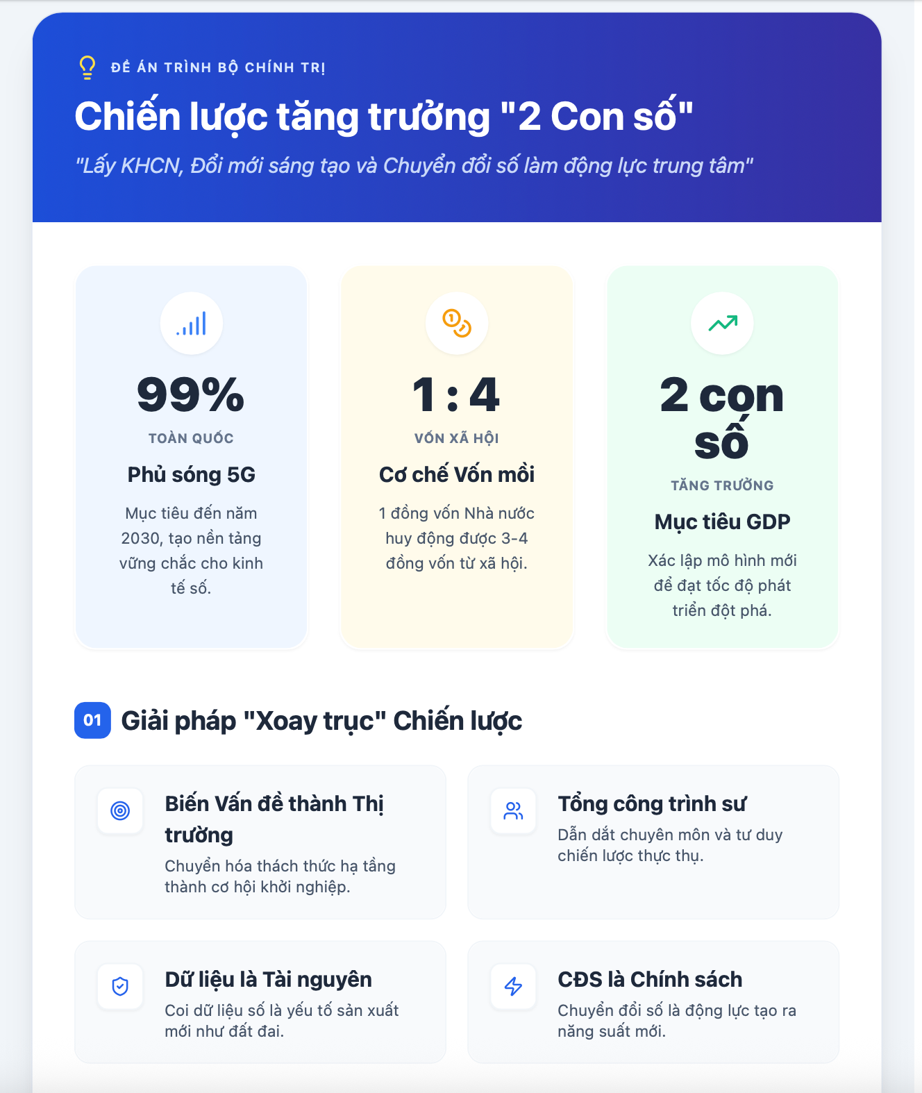 Trong mô hình này, KHCN, ĐMST và CĐS quốc gia cùng năng suất các nhân tố tổng hợp (TFP) không chỉ là công cụ hỗ trợ mà trở thành những trụ cột chiến lược, quyết định khả năng tăng trưởng nhanh và bền vững. Việc lượng hóa các nhiệm vụ, giải pháp và xây dựng lộ trình cụ thể gắn với trách nhiệm từng đơn vị là yêu cầu tiên quyết để đảm bảo tính khả thi trong kỷ nguyên số.