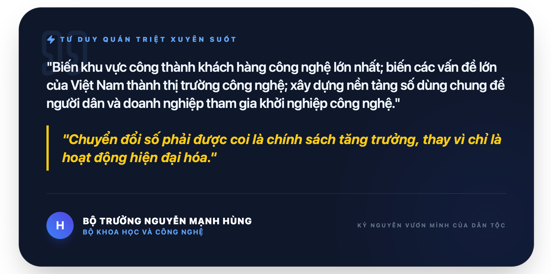 Một gợi mở chiến lược từ Bộ trưởng là biến khu vực công thành "khách hàng công nghệ" lớn nhất. Những thách thức như ô nhiễm môi trường, đô thị siêu nén hay quản trị thấp nếu tiếp cận theo cách truyền thống sẽ là gánh nặng chi phí. Tuy nhiên, nếu dùng tư duy công nghệ, đó chính là thị trường để thúc đẩy các chương trình khởi nghiệp sáng tạo quy mô quốc gia. Nhà nước đóng vai trò kiến tạo nền tảng, để doanh nghiệp và cộng đồng cùng tham gia giải quyết, từ đó sinh ra các ngành kinh tế mới.