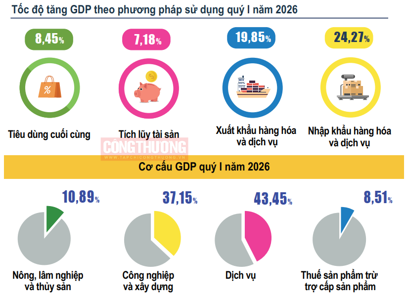 Về sử dụng GDP quý I/2026, tiêu dùng cuối cùng tăng 8,45% so với cùng kỳ năm trước, tích lũy tài sản tăng 7,18%, xuất khẩu hàng hóa và dịch vụ tăng 19,85%, nhập khẩu hàng hóa và dịch vụ tăng 24,27%.