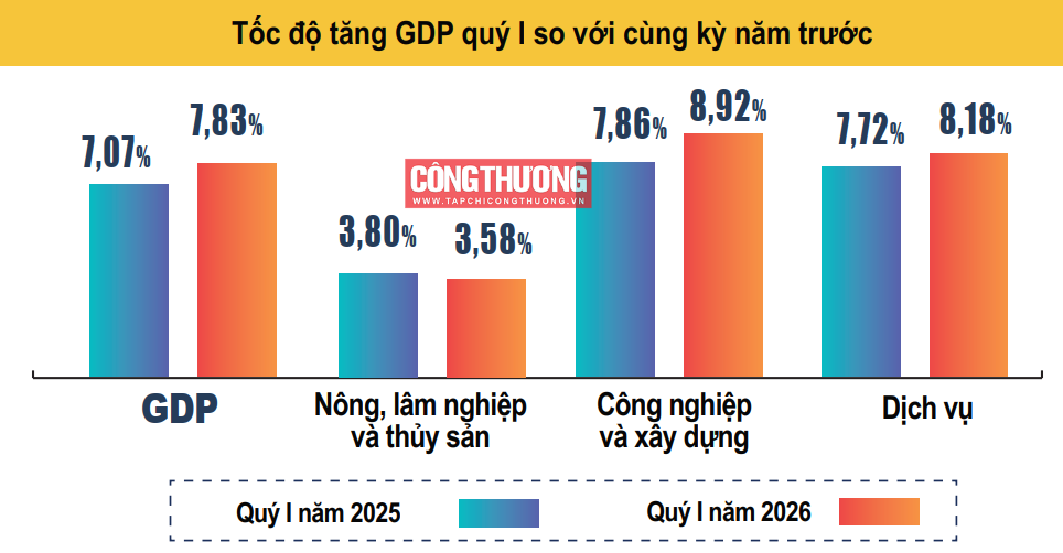 Tổng sản phẩm trong nước (GDP) quý I/2026 ước tăng 7,83% so với cùng kỳ năm trước (quý I/2025 tăng 7,07%).