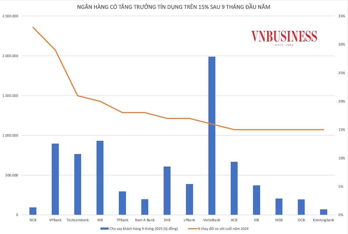 Theo số liệu tổng hợp từ báo cáo tài chính quý III và 9 tháng năm 2025 của 27 ngân hàng niêm yết, tổng dư nợ cho vay khách hàng tăng 15% so với cuối năm 2024, đạt hơn 13,6 triệu tỷ đồng. Trong đó, 22 ngân hàng có mức tăng trưởng dư nợ trên 10%; 4 ngân hàng có mức tăng trưởng tín dụng "một con số" là: BIDV, ABBank, Viet A Bank cùng ở mức khoảng 9%, PGBank tăng 7%. Duy nhất Saigonbank giảm 6%.