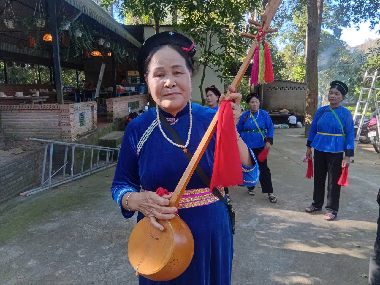 Bà Lý Thị Tiền, dân tộc Tày, thôn Tân Thành biểu diễn tiết mục văn nghệ