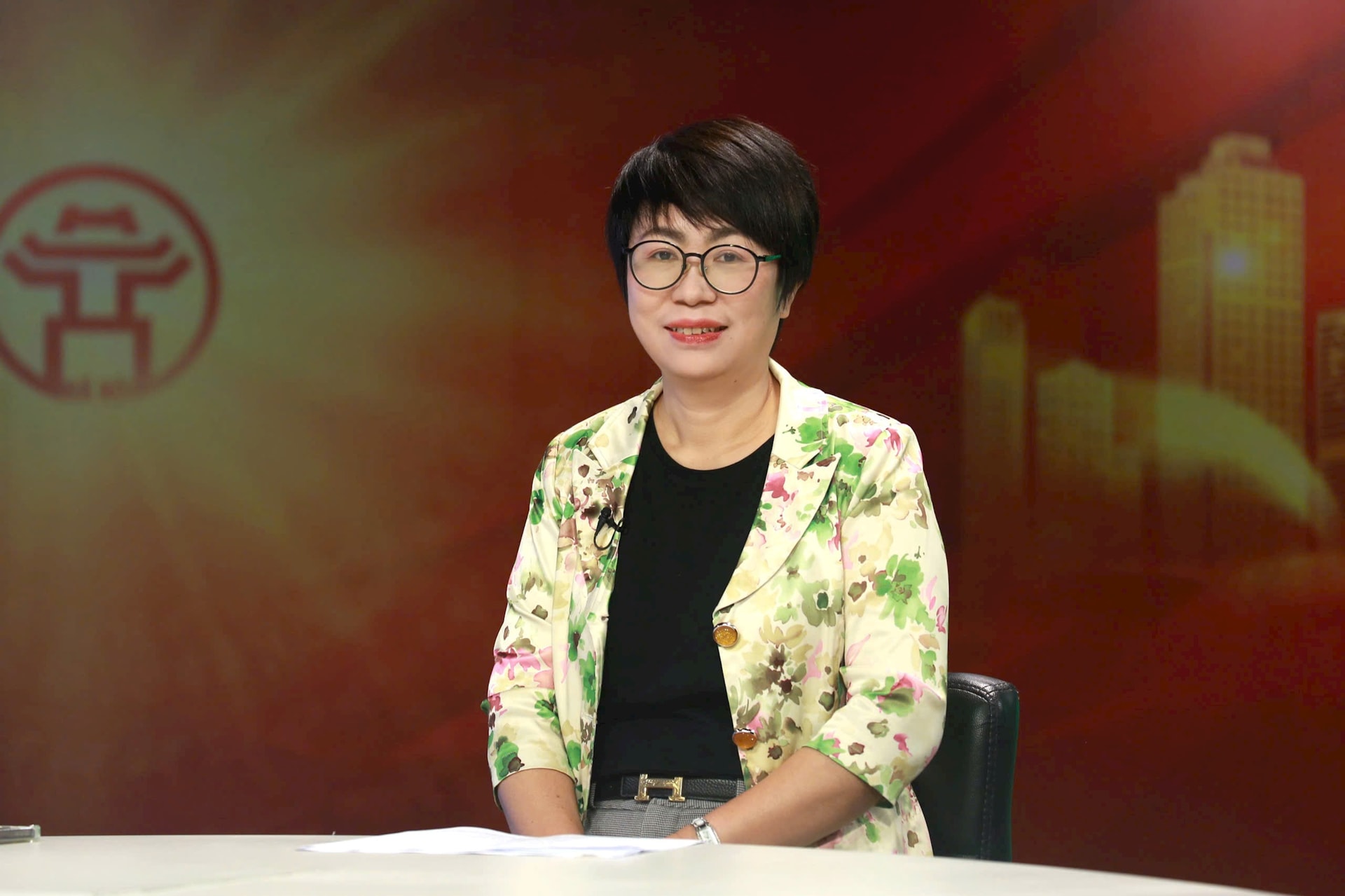 Phó Trưởng phòng phụ trách phòng Xây dựng chính quyền, Sở Nội vụ thành phố Hà Nội Vũ Minh Huyền tham dự chương trình thời sự của Cơ quan Báo và Phát thanh, Truyền hình Hà Nội, tối 4-4. Ảnh: Phạm Hùng