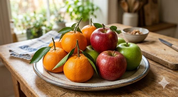 Cả táo và cam đều là nguồn cung cấp dồi dào vitamin và polyphenol có đặc tính chống oxy hóa. Ảnh: AI.