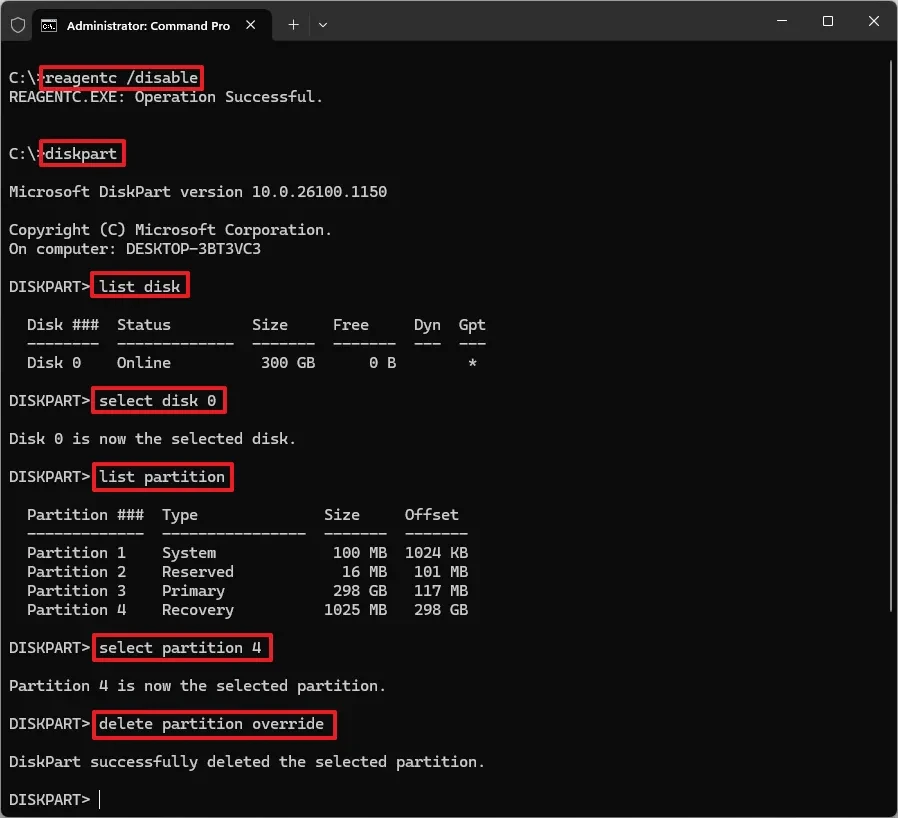 Sử dụng các lệnh list disk, select disk 0, list partition, select partition X, và delete partition override để xóa phân vùng phục hồi cũ.