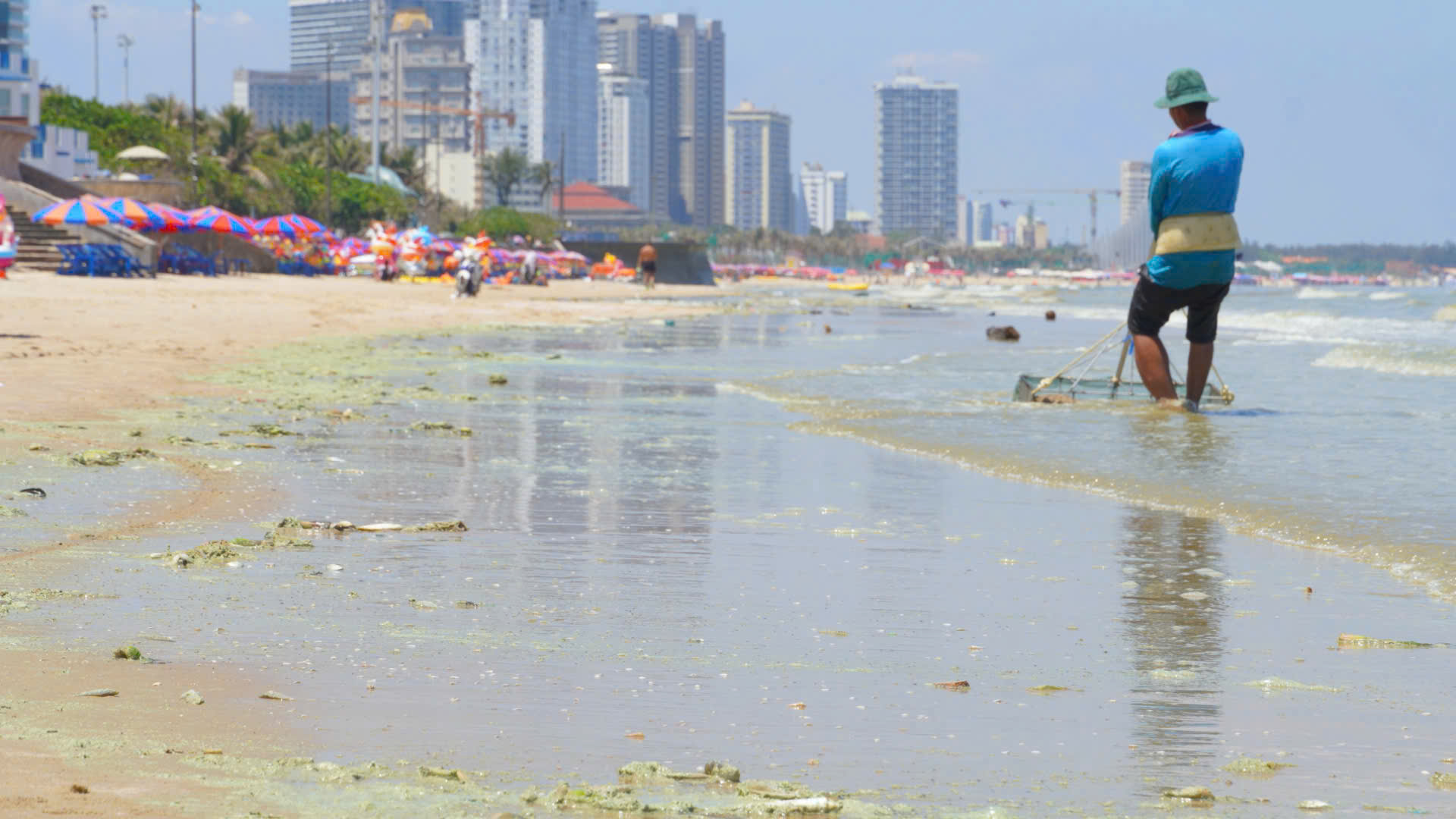 Tảo lam làm nước biển đổi màu khiến nhiều du khách và người dân lo lắng khi tắm biển