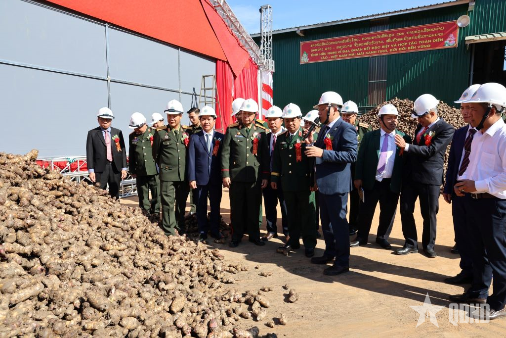Các đồng chí lãnh đạo địa phương, Bộ Quốc phòng Lào và Quân khu 4 tham quan Nhà máy chế biến nông sản Pha Daeng.