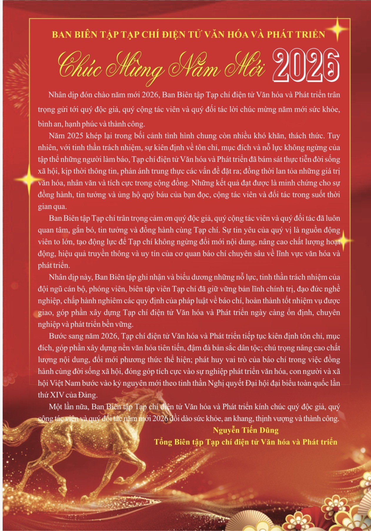 Một lần nữa, Ban Biên tập Tạp chí điện tử Văn hóa và Phát triển kính chúc quý độc giả, quý cộng tác viên và quý đối tác năm mới 2026 dồi dào sức khỏe, an khang, thịnh vượng và thành công.