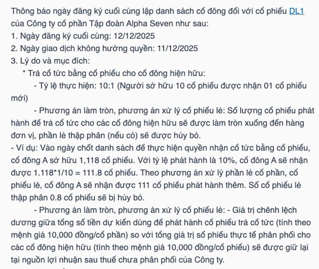 CTCP Tập đoàn Alpha Seven (mã ck: DL1) vừa ra thông báo sẽ đồng thời trả cổ tức bằng cổ phiếu và chào bán cổ phiếu cho cổ đông hiện hữu. DL1 chốt ngày 11/12 là ngày giao dịch không hưởng quyền cho 2 đợt phát hành trên.