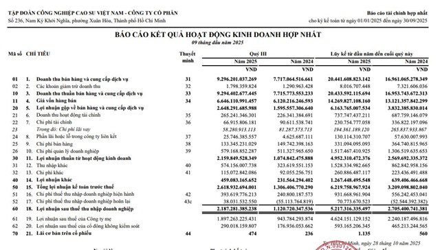 Về bức tranh tài chính, trong quý III/2025, GVR ghi nhận doanh thu thuần đạt 9.294 tỷ đồng, tăng 20,4% so với cùng kỳ năm ngoái.