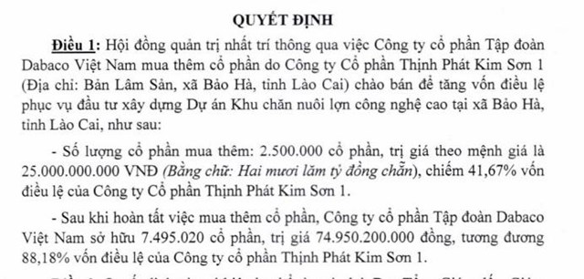Ở một diễn biến khác, Hội đồng quản trị CTCP Tập đoàn Dabaco Việt Nam cũng vừa thông qua quyết nghị việc mua thêm cổ phần tại Công ty cổ phần Thịnh Phát Kim Sơn 1. Doanh nghiệp này có trụ sở tại Bản Lâm Sản, xã Bảo Hà, tỉnh Lào Cai. Mục đích của việc mua thêm cổ phần tại Thịnh Phát Kim Sơn 1 là nhằm phục vụ đầu tư xây dựng dự án Khu chăn nuôi lợn công nghệ cao tại tỉnh Lào Cai, phục vụ chiến lược mở rộng hoạt động sản xuất kinh doanh của Tập đoàn.