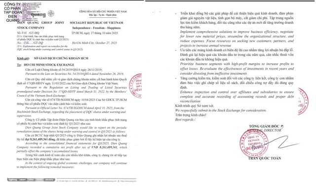 Cụ thể, Công ty Cổ phần Tập đoàn Điện Quang báo cáo tình hình khắ phục tình trạng cổ phiếu bị cảnh báo và kiểm soát định kỳ, quý III/2025.