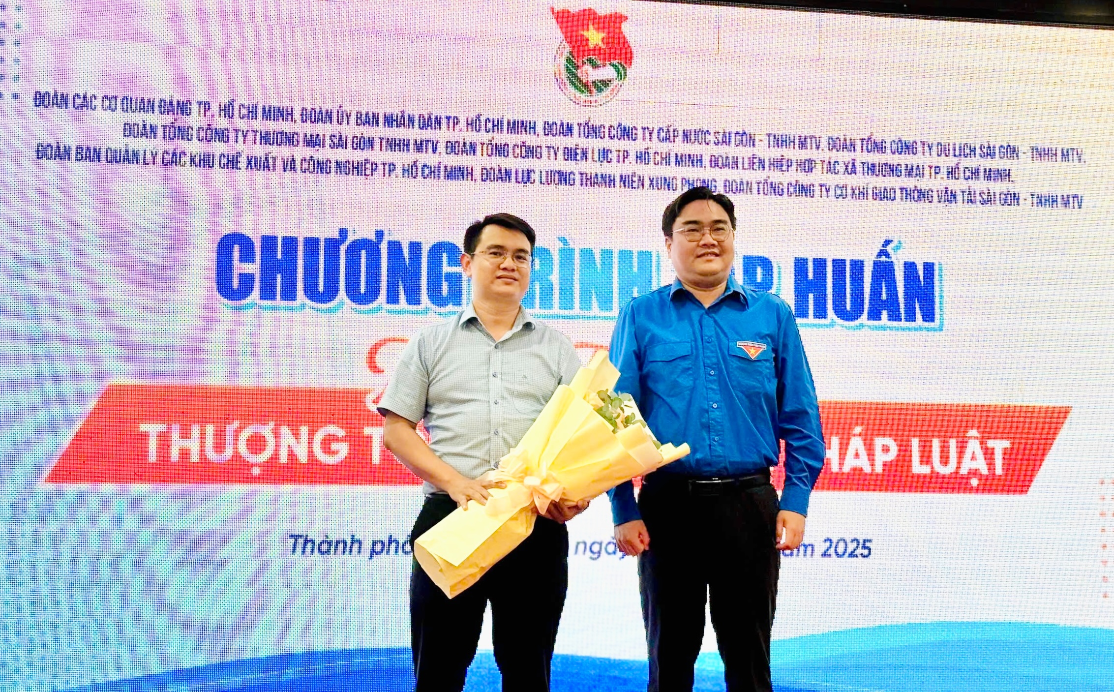 Bí thư Thành Đoàn TPHCM Ngô Minh Hải tặng hoa cho báo cáo viên