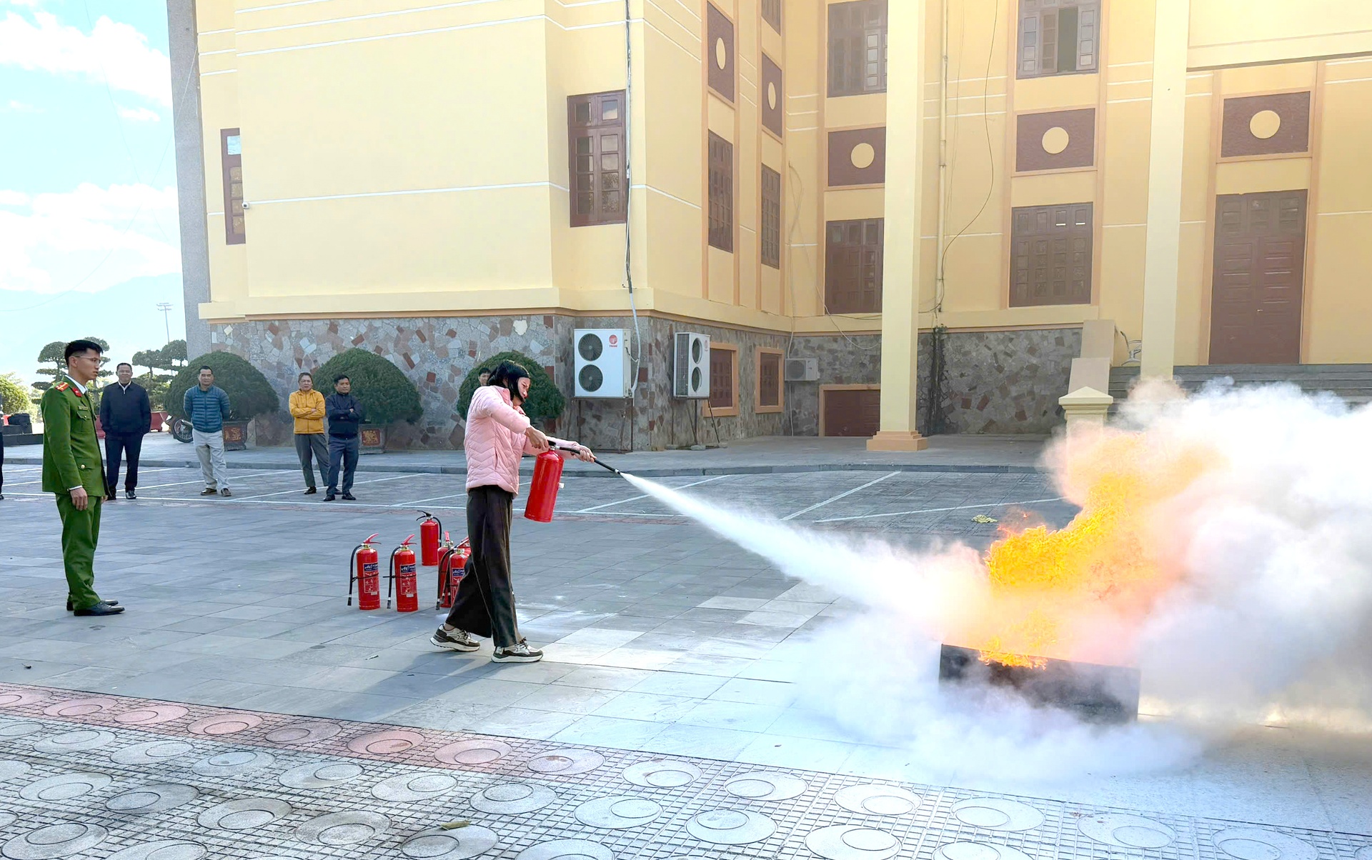 Học viên thực hành chữa cháy bằng bình chữa cháy cầm tay.