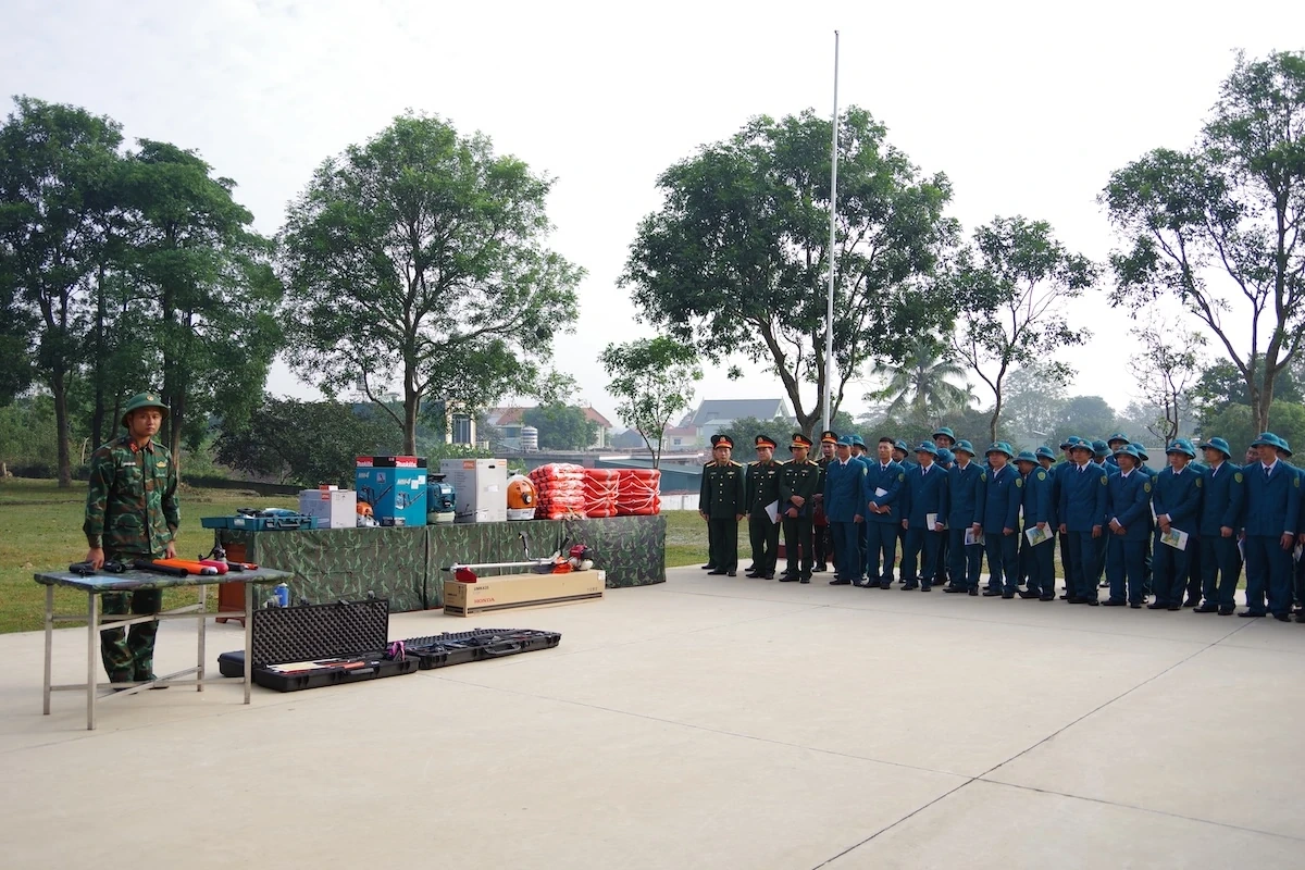 Đội mẫu hướng dẫn sử dụng trang bị tập huấn phòng thủ dân sự.