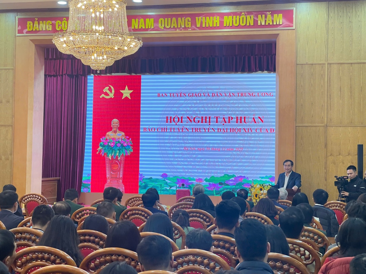 Phát biểu khai mạc Hội nghị tập huấn báo chí tuyên truyền Đại hội XIV tại các điểm cầu trên toàn quốc, đồng chí Phan Xuân Thủy, Phó Trưởng Ban Tuyên giáo và Dân vận Trung ương, Phó Giám đốc Thường trực Trung tâm Báo chí Đại hội XIV của Đảng cho biết, thời điểm cuối năm 2025 được xác định là “cao điểm” của công tác tuyên truyền về Đại hội Đảng. Theo đó, tuyên truyền hướng tới góp phần chuẩn bị, tổ chức thành công Đại hội; tạo bầu không khí vui tươi, phấn khởi; nâng cao nhận thức và thống nhất tư tưởng, hành động trong toàn Đảng, toàn dân, toàn quân; đồng thời khơi dậy tinh thần yêu nước, ý chí tự lực tự cường, sự tự tin và khát vọng xây dựng đất nước hùng cường, thịnh vượng, quyết tâm thực hiện thắng lợi các mục tiêu, nhiệm vụ mà Đại hội đề ra.