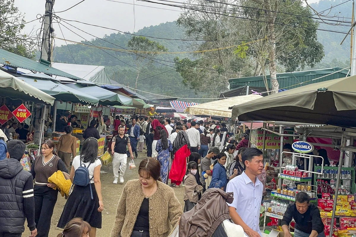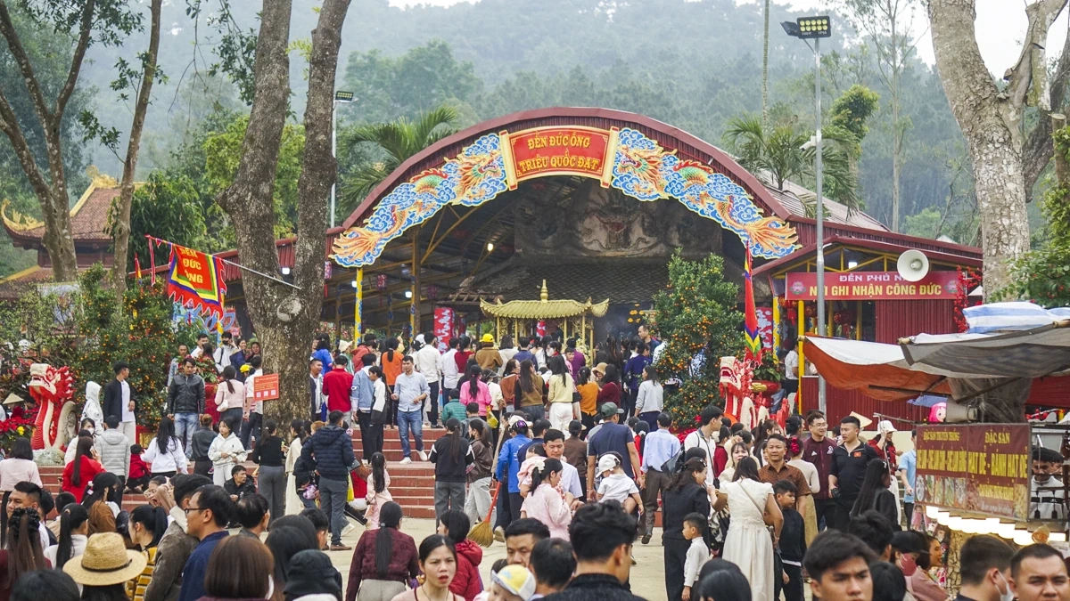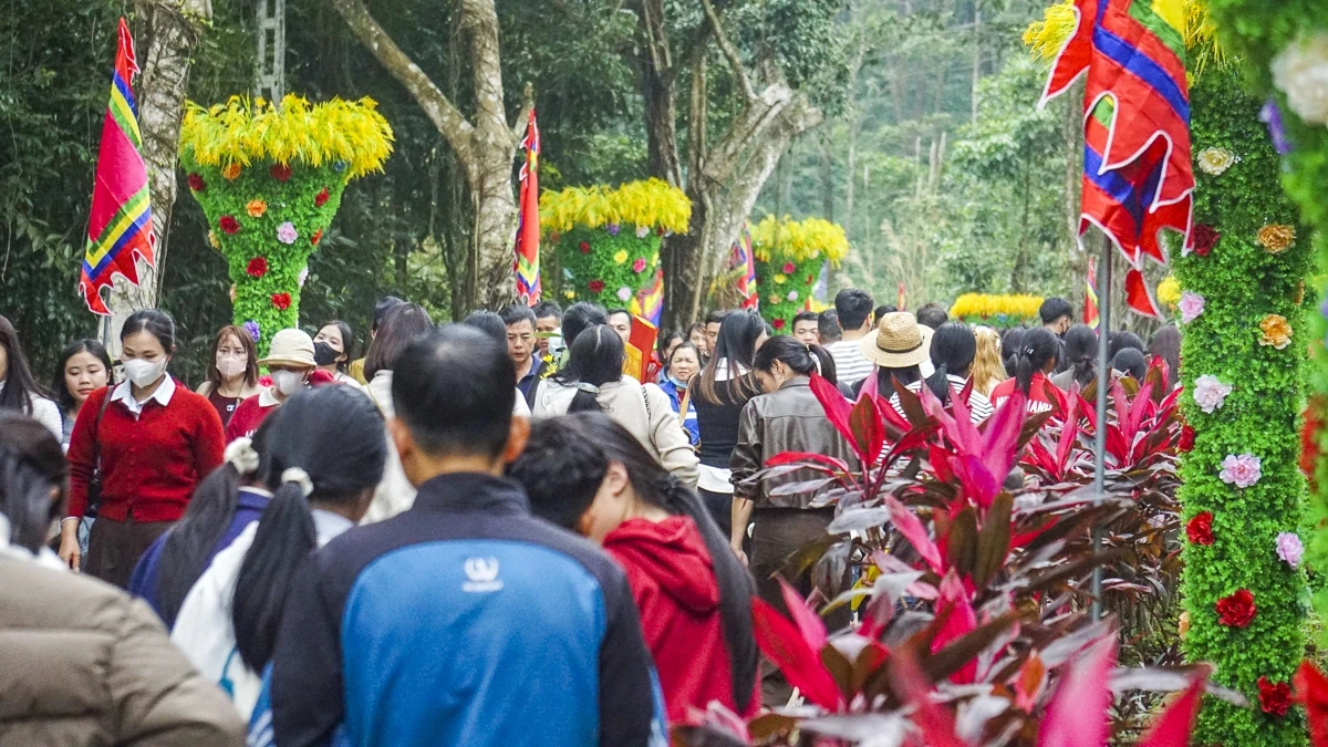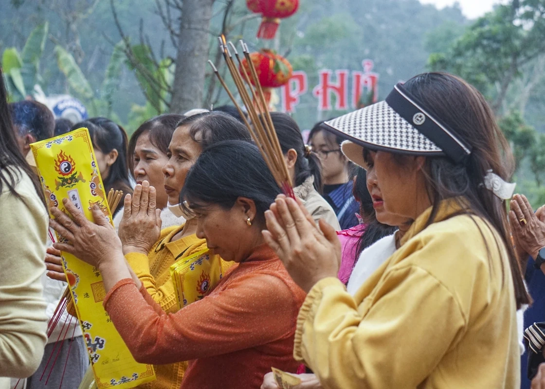 Không chỉ trong khuôn viên di tích, khu vực chân núi cũng nhộn nhịp như một phiên chợ xuân thu nhỏ. Dịch vụ ăn uống, giải khát, bán đặc sản rừng hoạt động hết công suất. Nhiều hộ dân địa phương tận dụng cao điểm lễ hội để tăng thu nhập đầu năm.
